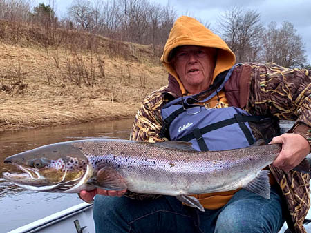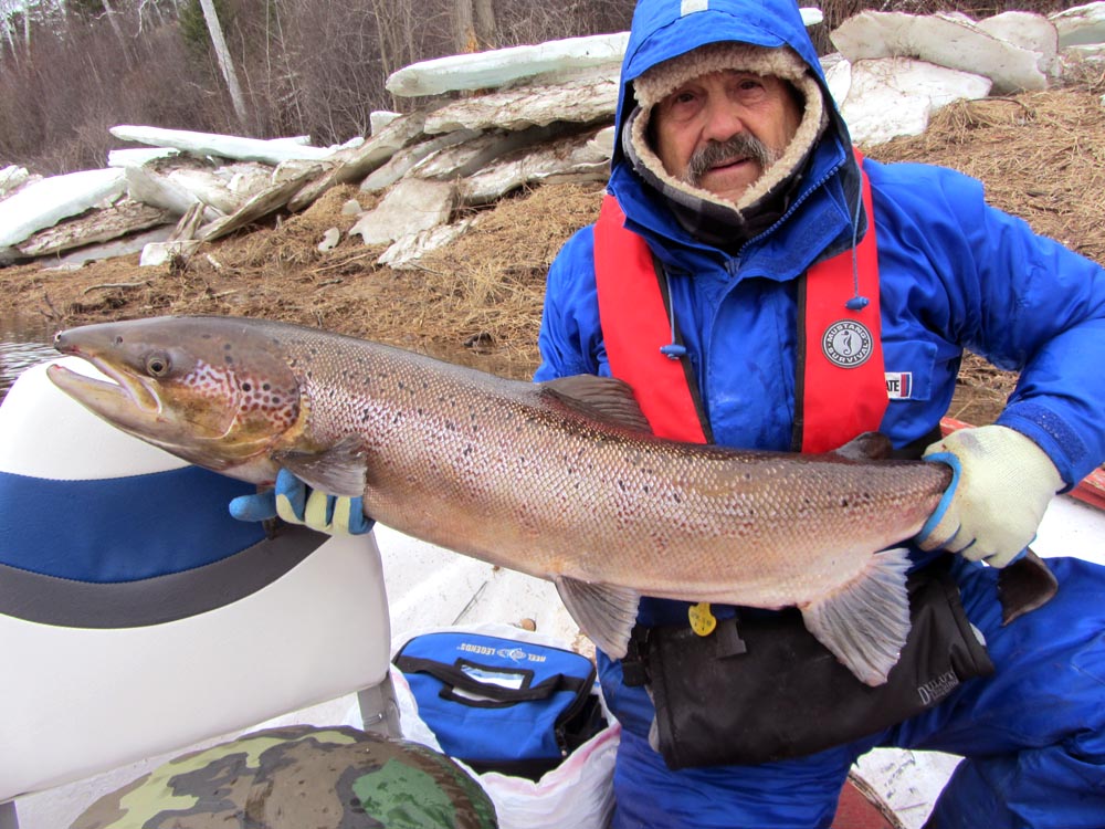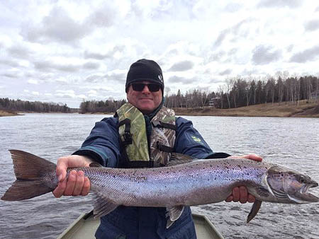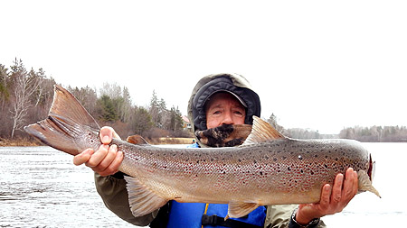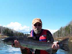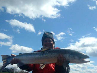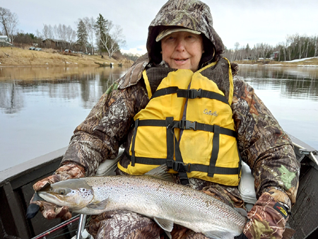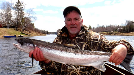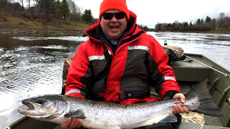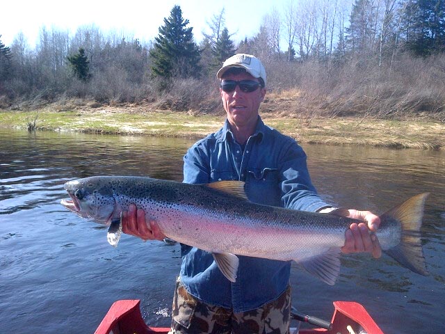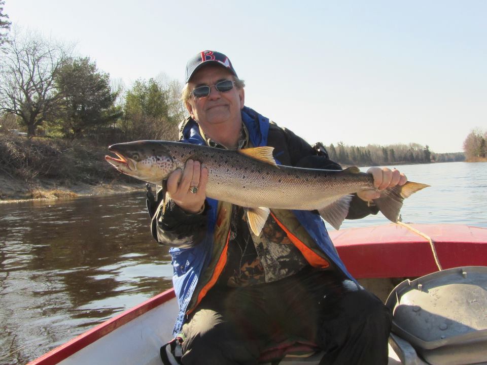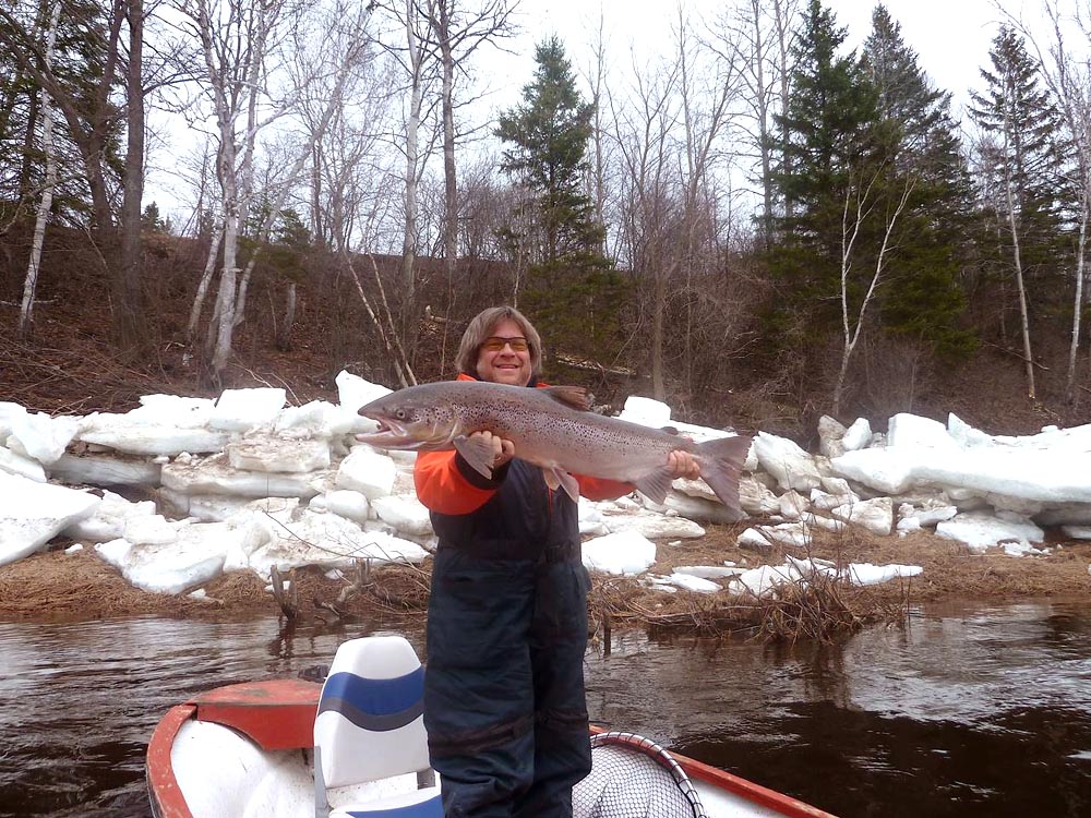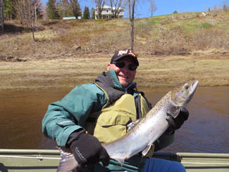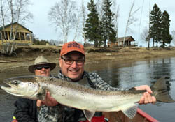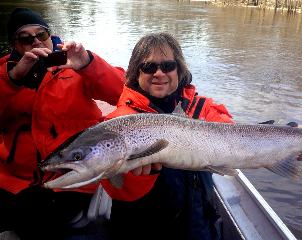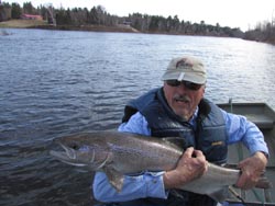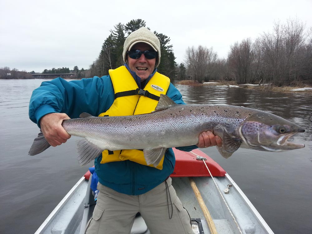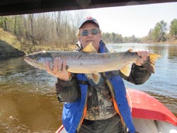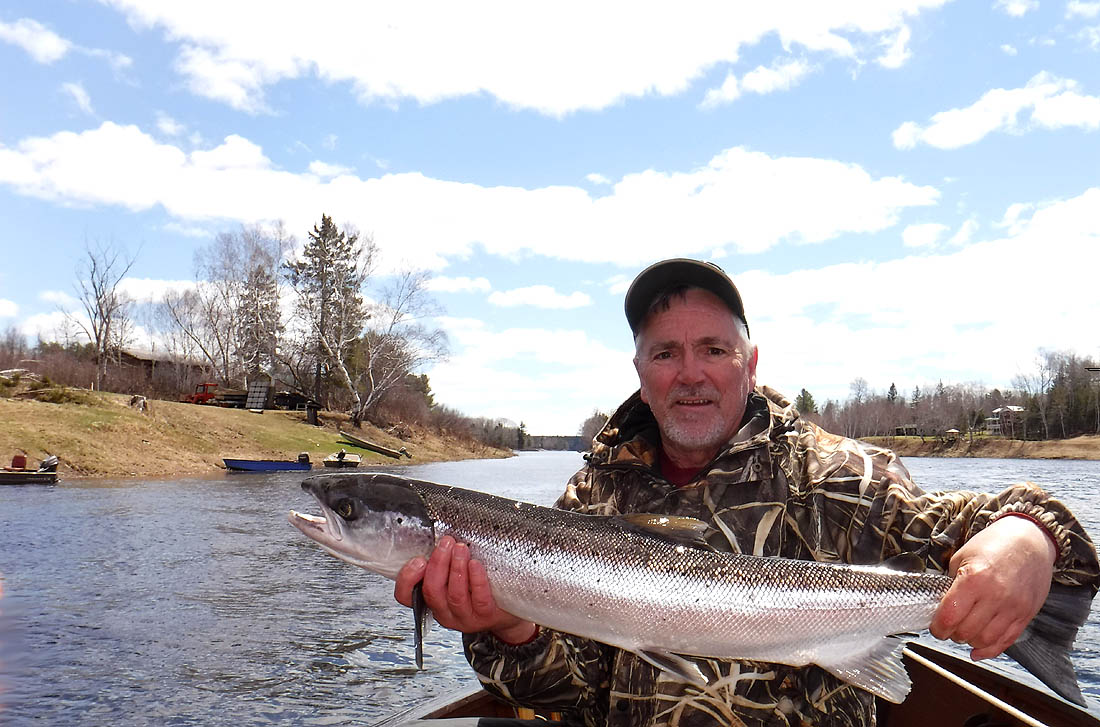 After one of the most wonderful first weeks of salmon fishing, with great weather and great fishing, the weather sure changed in a hurry, with heavy rain and winds for a number of days. Overall, however, it was still a good week for catching fish. Tuesday afternoon and Wednesday, the water rose so fishing slowed down but it picked up again on Thursday morning and good fishing continued right where it left off early Tuesday, with many anglers landing their limits daily throughout the weekend. For as long as we have been in business we have never seen such a quick rise and fall in water height! An 11 foot rise then 8 foot drop - all in only 48 hours. The rise in water levels put the damper on good fishing on Tuesday and Wednesday but it did bring some monster salmon into the system with fishermen landing good numbers of 40+" salmon every day since Thursday. With the opening of the trout season tomorrow anglers are now getting excited about landing some of those 6-7 lb. trout we land each spring. There have not yet been many big ones reported so far but we think it may still be a little early. We are still receiving good reports from salmon fishermen upriver and with the rise in water, it should be good for boating and fishing for quite a while. April 22nd