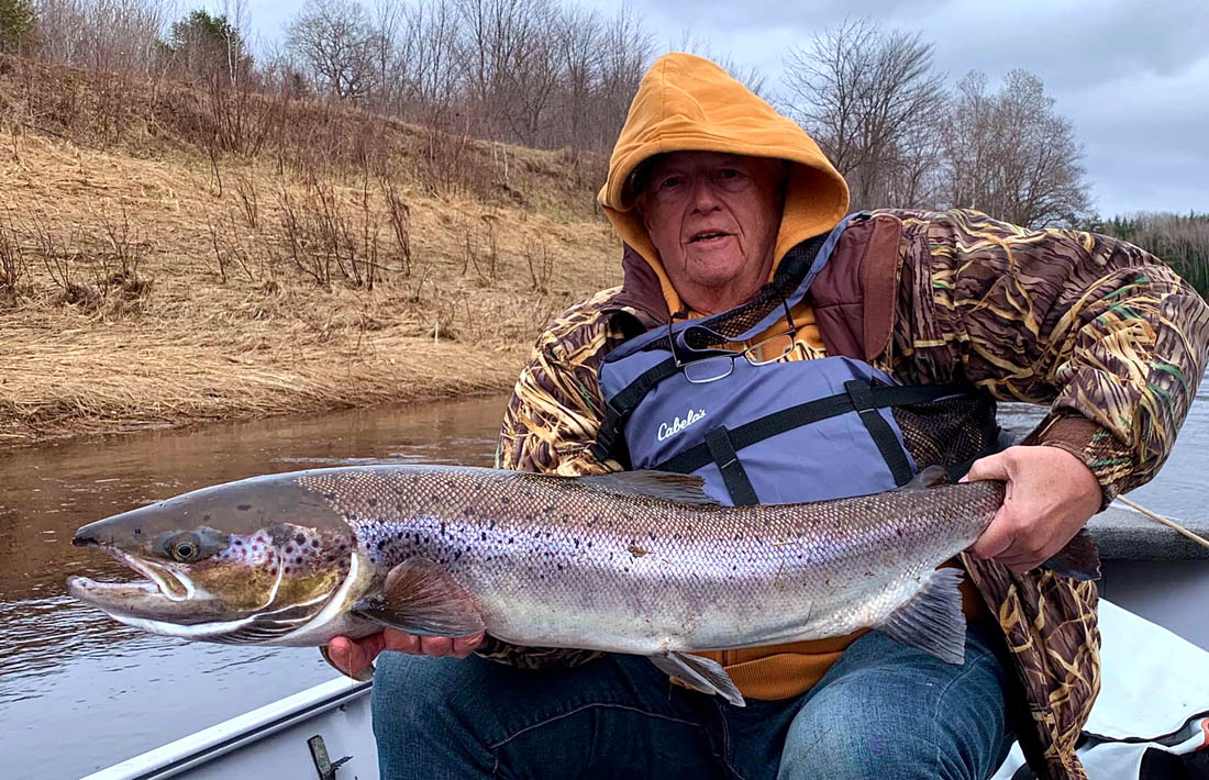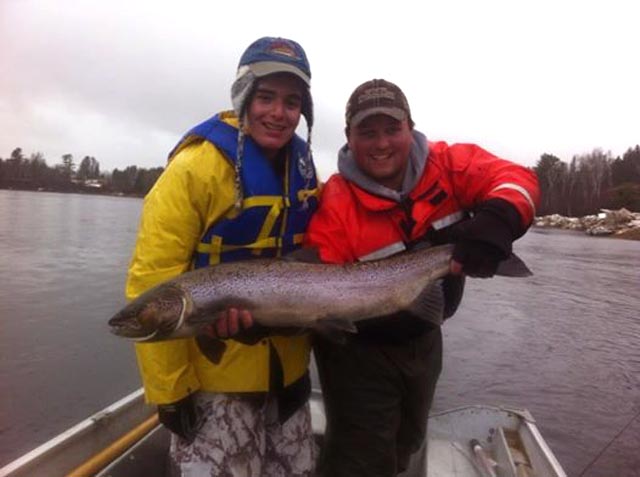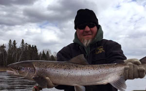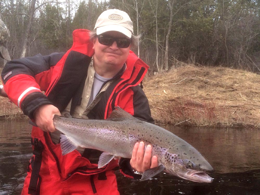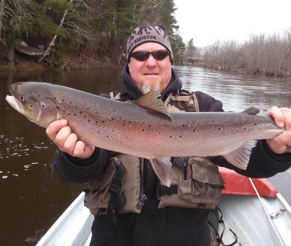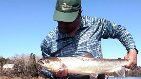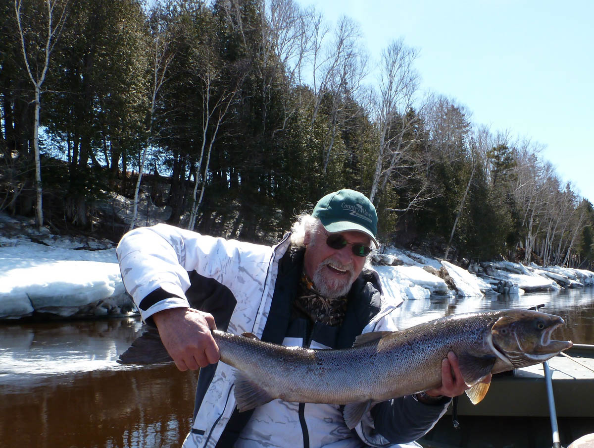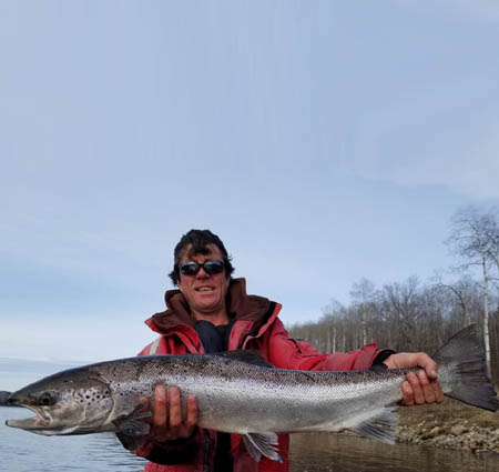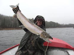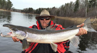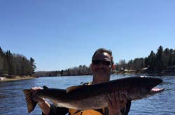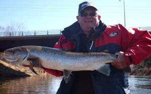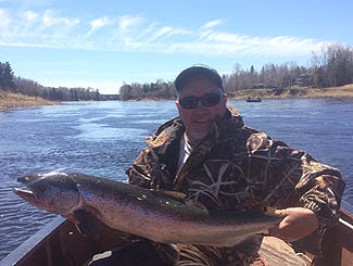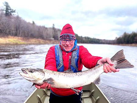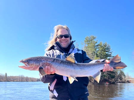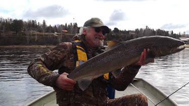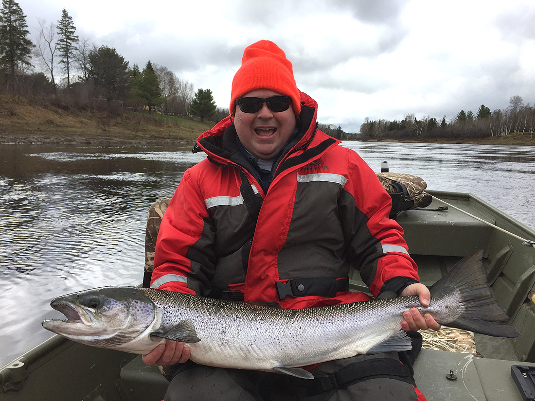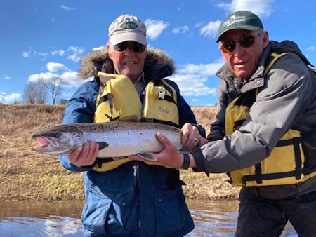 After one of the most wonderful first weeks of salmon fishing, with great weather and great fishing, the weather sure changed in a hurry, with heavy rain and winds for a number of days. Overall, however, it was still a good week for catching fish. Tuesday afternoon and Wednesday, the water rose so fishing slowed down but it picked up again on Thursday morning and good fishing continued right where it left off early Tuesday, with many anglers landing their limits daily throughout the weekend. For as long as we have been in business we have never seen such a quick rise and fall in water height! An 11 foot rise then 8 foot drop - all in only 48 hours. The rise in water levels put the damper on good fishing on Tuesday and Wednesday but it did bring some monster salmon into the system with fishermen landing good numbers of 40+" salmon every day since Thursday. With the opening of the trout season tomorrow anglers are now getting excited about landing some of those 6-7 lb. trout we land each spring. There have not yet been many big ones reported so far but we think it may still be a little early. We are still receiving good reports from salmon fishermen upriver and with the rise in water, it should be good for boating and fishing for quite a while. April 22nd