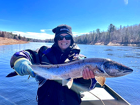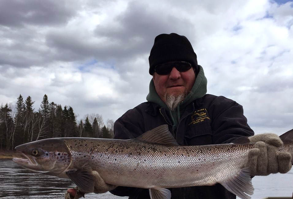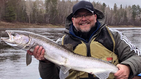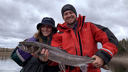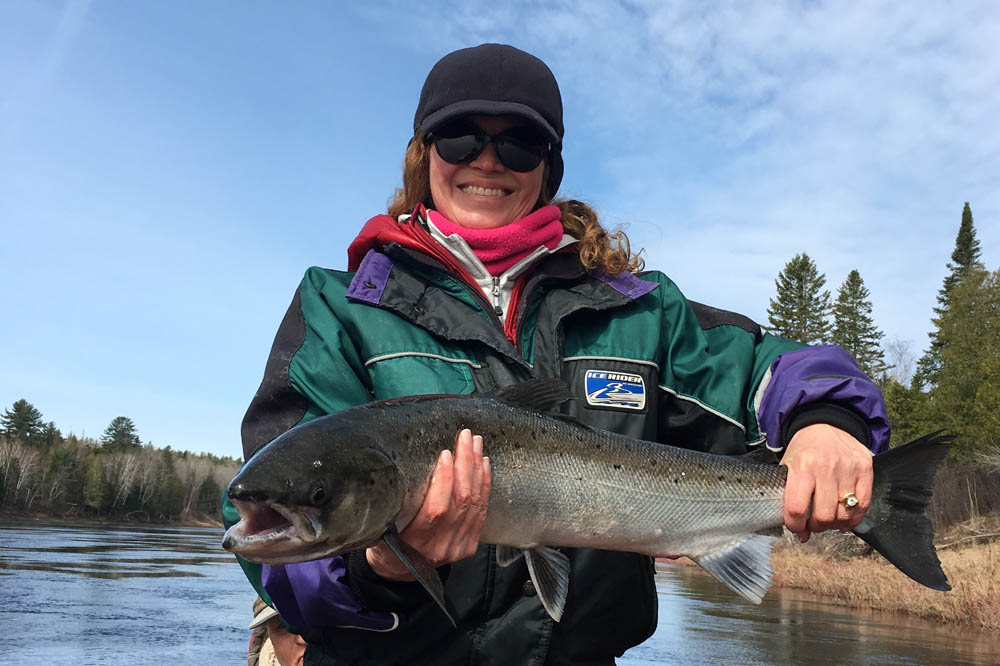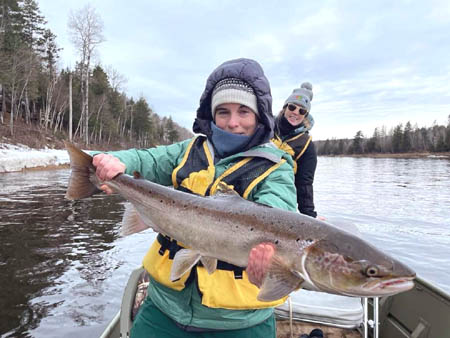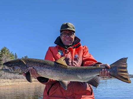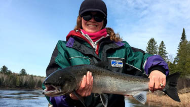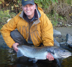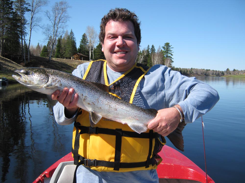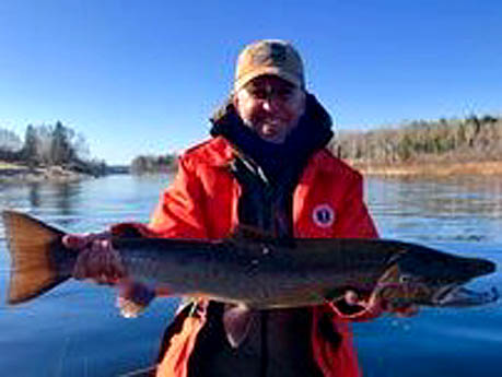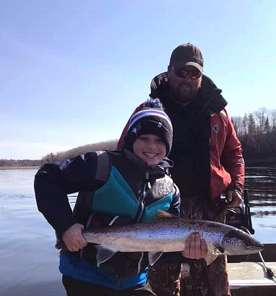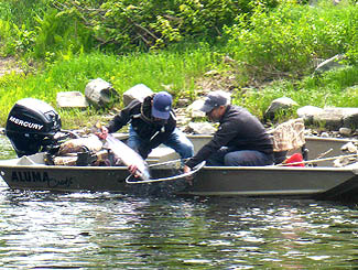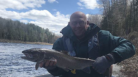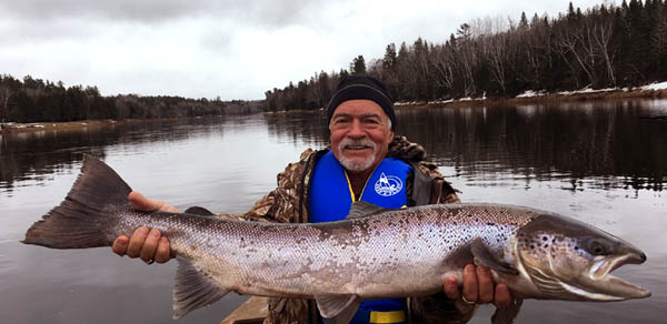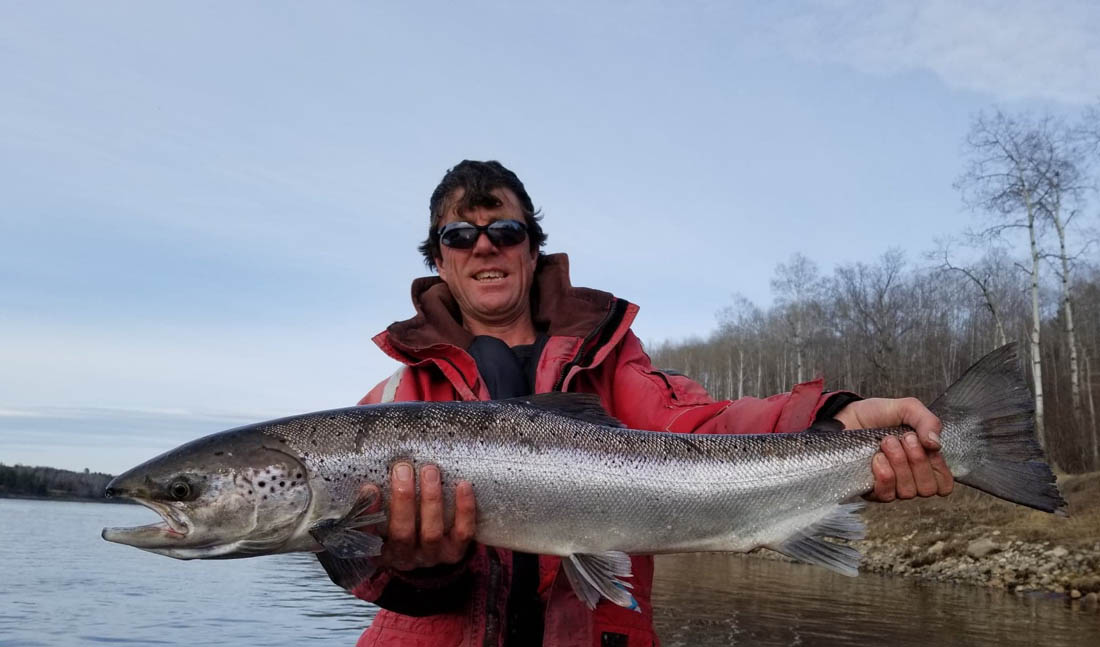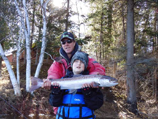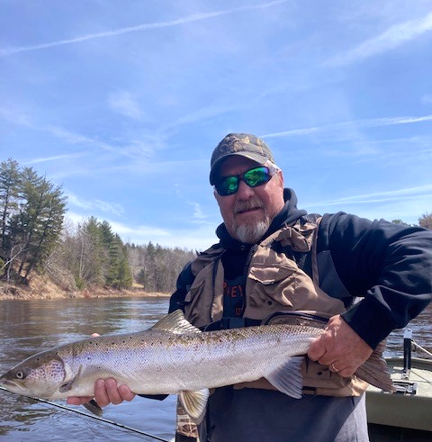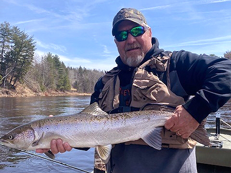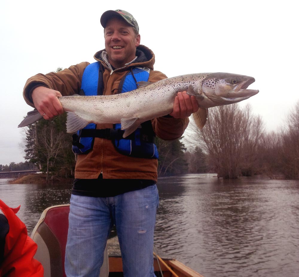 After one of the most wonderful first weeks of salmon fishing, with great weather and great fishing, the weather sure changed in a hurry, with heavy rain and winds for a number of days. Overall, however, it was still a good week for catching fish. Tuesday afternoon and Wednesday, the water rose so fishing slowed down but it picked up again on Thursday morning and good fishing continued right where it left off early Tuesday, with many anglers landing their limits daily throughout the weekend. For as long as we have been in business we have never seen such a quick rise and fall in water height! An 11 foot rise then 8 foot drop - all in only 48 hours. The rise in water levels put the damper on good fishing on Tuesday and Wednesday but it did bring some monster salmon into the system with fishermen landing good numbers of 40+" salmon every day since Thursday. With the opening of the trout season tomorrow anglers are now getting excited about landing some of those 6-7 lb. trout we land each spring. There have not yet been many big ones reported so far but we think it may still be a little early. We are still receiving good reports from salmon fishermen upriver and with the rise in water, it should be good for boating and fishing for quite a while. April 22nd