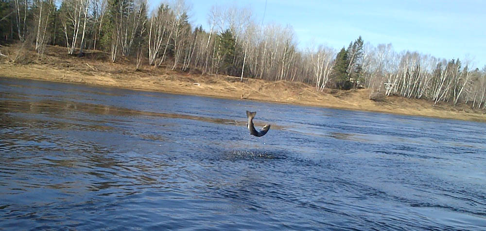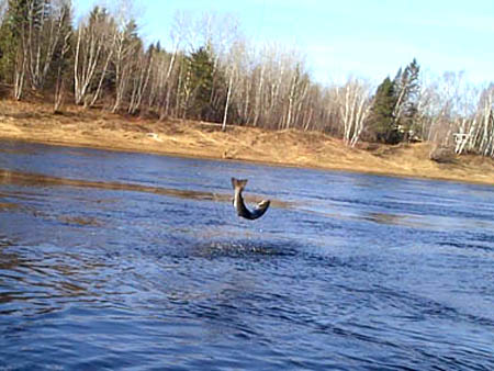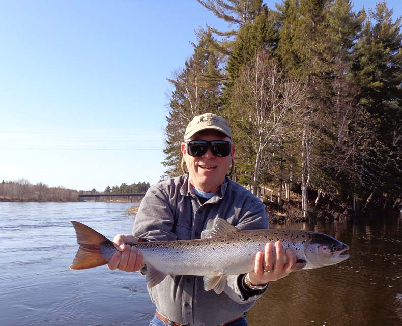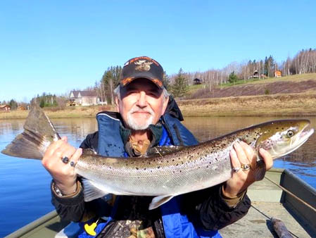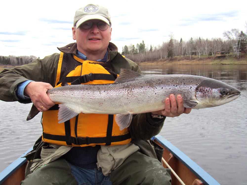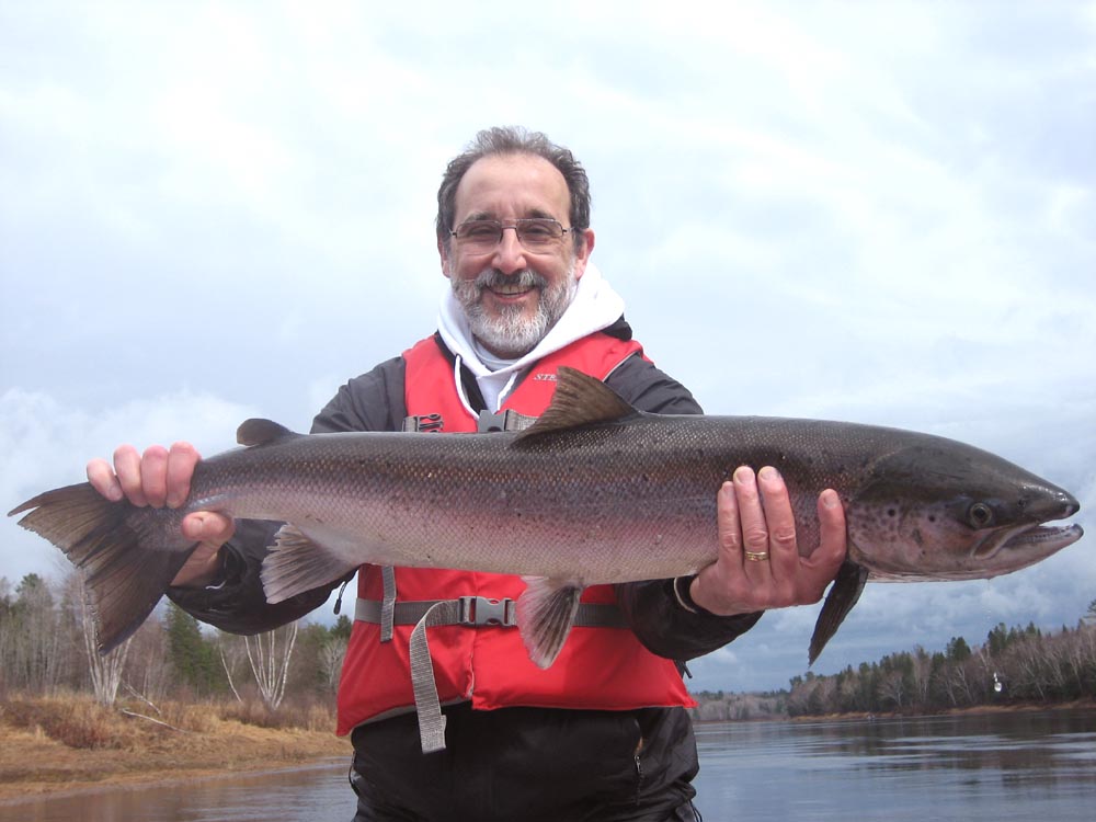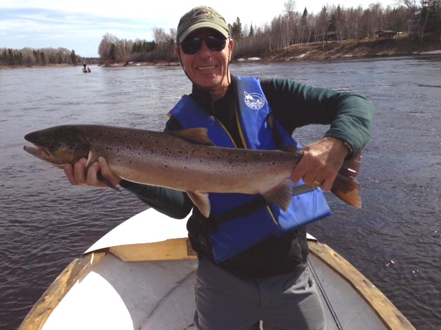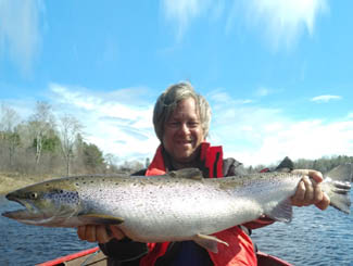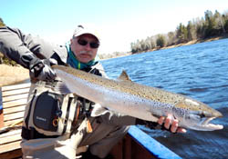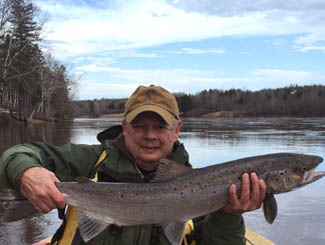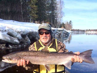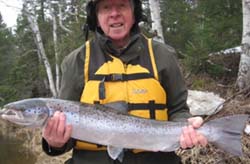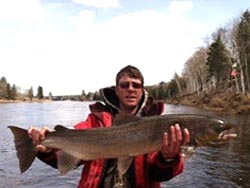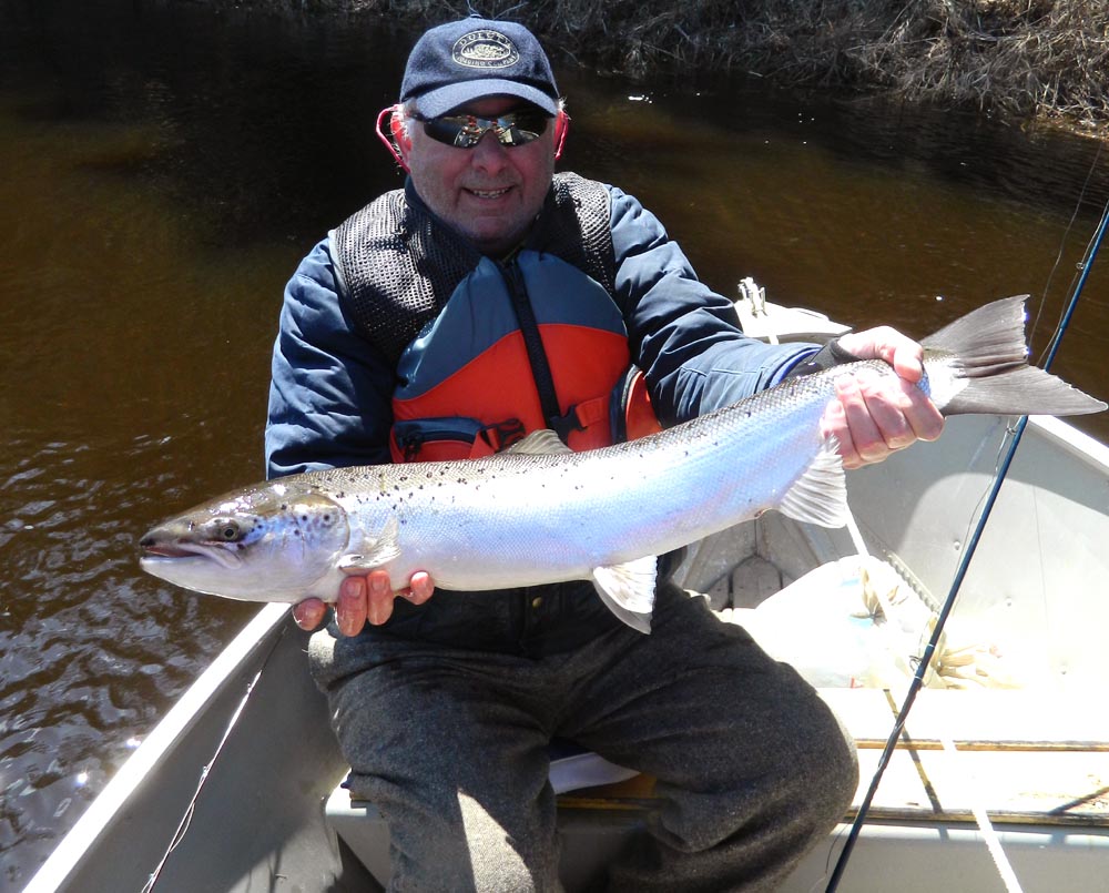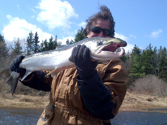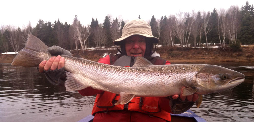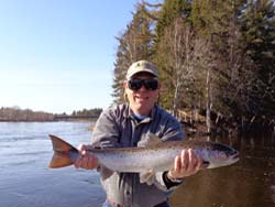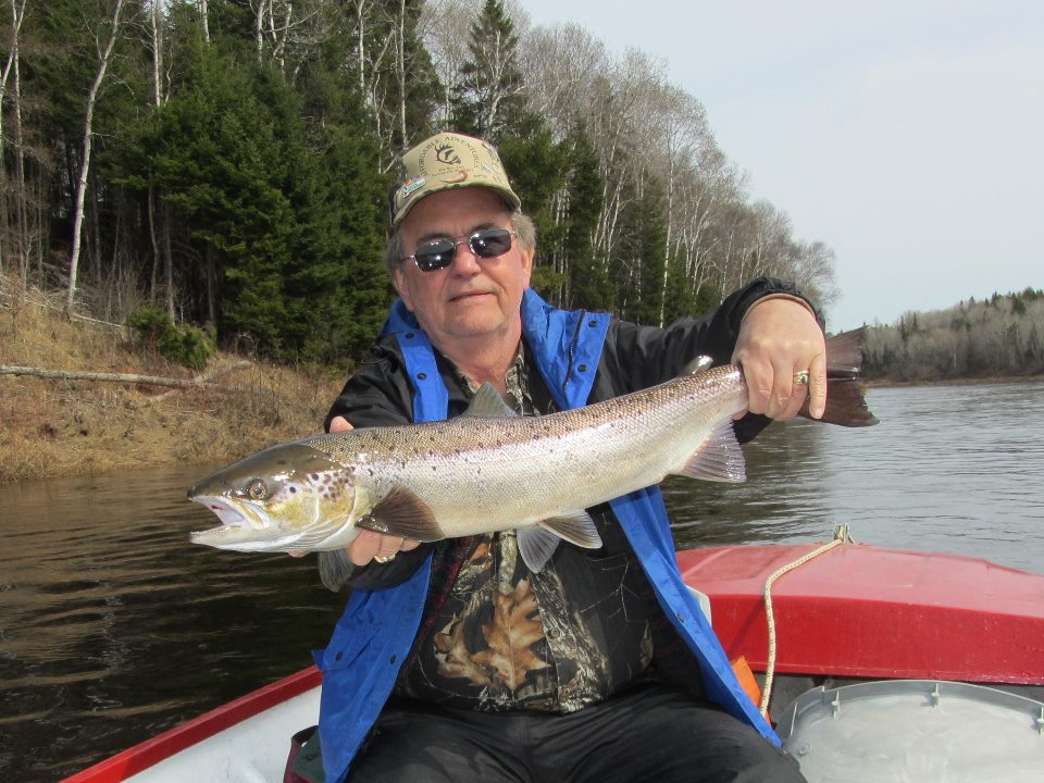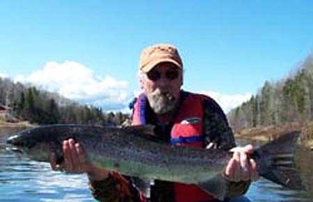 So Much for the early ice out and people thinking the fish might move out early, as fishermen are still catching fish from Boisetown to below Barnaby River in the tidal water -.70 km of salmon. Although the number in the upper stretches of the river are slowing down, fish are still being landed every day. This has been another great week on the water with much nicer weather than last week and some very big salmon around. This week has also been a much better week for casters as there was no wind and some trophy-sized salmon have been caught. With the lower and clear water again this week, there are a lot more Salmon showing, making anglers really appreciate the great numbers of fish in the system both this year and last year. We had a fishermen from New Jersey who counted over 50 fish jumping in a single day, near the mouth of the Cains river. Some say it looked much more like September fishing than spring fishing. Although the Salmon fishing has remained consistantly good, there still is not a lot to report on the trout fishing as not too many big ones have been seen as of yet. We are receiving some reports that the Trout fishermen below Quarryville are having more success hooking Striped bass while fishing for Trout than actual Trout. Anyway, there should be more large trout later as we get into May. Any salmon fishermen who might still want to get out on the water for a day or two should have a good chance for a while yet, especially in the lower stretches of the Rivers ( They might need to work harder for them from now on but could catch the "Big" One ). Floating lines or sinking tip only lines with 2/0 Gray Ghost and Smelt pattern spring flies are working well. There are even a few now being landed on #6 White Tail Green Machine.