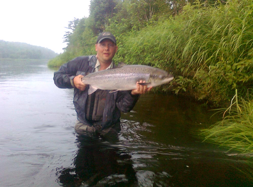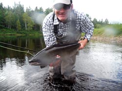 The start of summer fishing has been just what the fishermen ordered - lots of water and plenty of fish moving through the system this early in the season. With good early results on the Nor'west in May and now some nice big salmon landed on the Main Southwest, Renous and Dungarvon over the past couple of weeks, it's making for an early start to this year's summer fishing. Depending on conditions, June can either be great - with fish arriving early in good numbers - or just trickling in until late June or early July before the big runs start. Even with higher-than-normal water levels for summer fishing, anglers have been experiencing good results. It's a bit early yet but with the great numbers so far, anglers are starting to hope and talk about a repeat of 2011 when the salmon started in early June and continued daily until closing in October. There might not be as many fish entering the rivers in June as in later months - even in a good year - but one thing is for sure - they are some of the nicest, freshest and silver salmon, and pound-for-pound, the best fighters of the season. With June always being so "hit-and-miss" and different each year, we choose to book the majority of our angling guests from June the 15th on - to be safe rather than sorry - and as a result, in some years, we miss out on good early fishing. Again, this year, some of the fishermen we did have early have seen some fine action. With the higher water, fishermen have been landing most of their salmon on #4 and even #2 flies but the majority of fish have been landed on White Tail Green Machines.