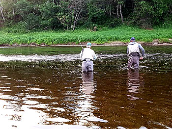With a few days of record hot temperatures and the water becoming warmer each day, fishing has slowed down big-time since June and the first week of July. The water is still at a good height for our lower river pools but a bit low for upriver pools and tributaries but with the salmon concentrating more in cold water areas, they are not very interested in taking a fly. Even with the lesser conditions we did have some beginners' luck over the past week with first-time fly-fisherman 16 year old Garon Molyle From Edmonton Alberta who landed a 20 Lb'er, and 12 year old Danny Hamilton from Ottawa who landed a 16 Lb'er on the first morning. With the salmon staying in these cold water brooks, the D.F.O. has decided - starting today - to close some of these areas to fishing until the water cools. Closing these areas does not really effect much of the river system as most of these spots are not where most anglers like to fish, so it's still 'fishing as usual' on the Miramichi - even though the Media might make it sound like fishing is over for the season. If you already have a trip booked to the Miramichi, you should check with your Outfitter to see if any of these closures will effect your particular fishing trip. We do suggest using dry flies as much as possible if fishing in areas where salmon are pooling up and also taking extra care while playing and releasing fish. If these conditions continue, your Outfitter will probably work with you to reschedule a later date if possible.