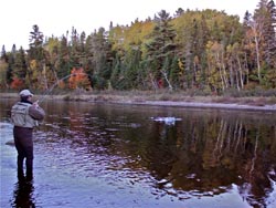 Another fall week and Spey Week Clinic in the books for another year on the Miramichi, as East Coast Spey from NJ returned for their annual week of clinics and fishing on the Miramichi. With the rise in water levels over the weekend, many of the pools were a bit high and dirty at the beginning of the week but as the week went along, anglers did most of their fishing on the Cains, Renous and on the main River above the mouth of the Cains. Like most weeks this summer and fall, the catches were not as high as the same period in past years, but fishermen still landed some nice big salmon. Again this week almost all of the fish landed were salmon as there have not been a lot of grilse so far this season. Anglers used more fall patterns like the GP, Shrimps and the LT Special. With the rise in water and the fresh fish moving up through the system early last week in the upper stretches of the Miramichi like Wilson's should result in some good fishing when these fish arrive. Among the fall colors our anglers always enjoy fishing the smaller tributaries of the Cains, Renous and the Nor'west at this time of year. This makes for a great day trip for someone packing a lunch and spending the day on a tributary with a good chance of landing salmon or spotting a wide variety of wildlife including moose. A canoe and fishing trip down the Cains is also very nice in the fall season and many fishermen try to do this each fall. With only a week of salmon fishing remaining on this stretch of the Miramichi we all should enjoy it as it will be another long six months before we get back on the water again for Atlantic Salmon Fishing.